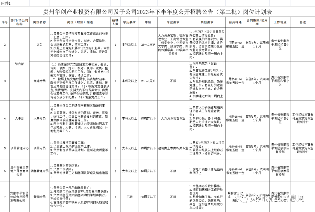 本次主招聘方为贵州华创产业投资有限公司(以下简称“总公司”)。具体招聘岗位及条件详见附件1《贵州华创产业投资有限公司及子公司2023年下半年度公开招聘公告(第二批)岗位计划表》。