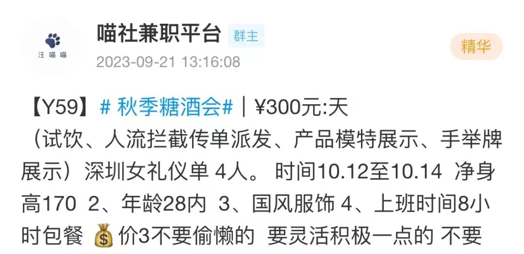 另:若在兼职活动合作的过程中,遇到任何押金索取/服装费用/恶意克扣工资/恶意拖欠工资等任何活动方违规行为,均可在深圳喵社-曝光举报栏发布处理(不可涉及个人隐私)