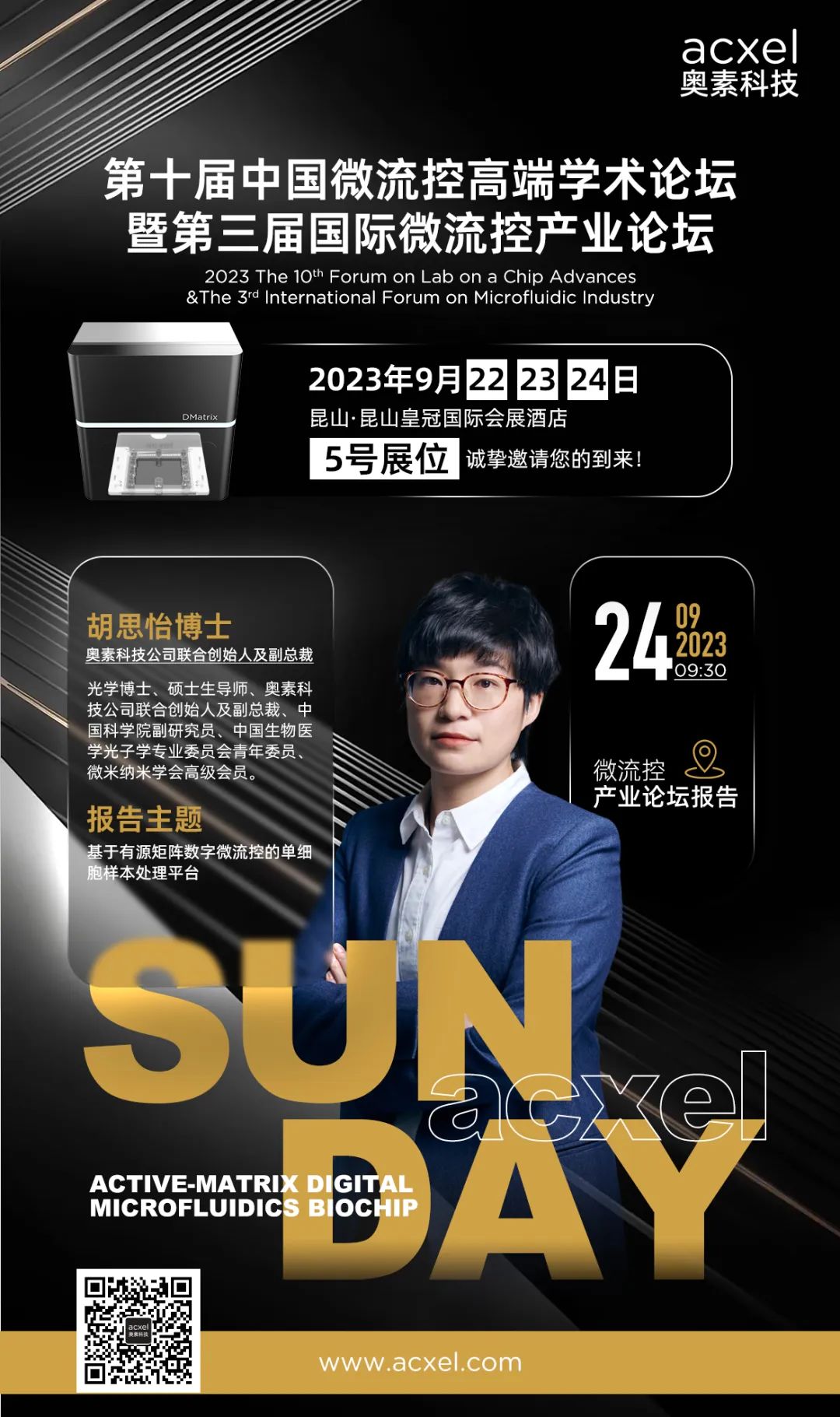9月22-24日,第十届中国微流控高端学术论坛暨第三届国际微流控产业论坛将在昆山皇冠国际会展酒店拉开帷幕。本届“双论坛”将立足微流控芯片这一当代极为重要的新兴科学技术平台和国家层面产业转型的潜在战略领域,面向经济主战场、面向人民生命健康、面向世界科技前沿、面向国家重大需求,将促进理、工、医、产业界、投资界等领域的学术交流和产业互动,也将助推微流控技术在医学、生命科学等相关领域的持续深入发展。作为从事高端生命科学仪器开发,拥有自主研发的半导体数字微流控平台的企业,奥素科技受邀参与本次盛会。奥素科技将在5号展位展出全新登场的DMatrix™有源数字微流控开放生态,诚挚邀请各位专家、学者莅临展位与我们探讨交流。会议期间,奥素科技副总裁胡思怡博士将在9月24日上午9:30举办的微流控产业论坛作主题为《基于有源矩阵数字微流控的单细胞样本处理平台》的报告分享,欢迎各位专家、学者莅临收听。为了和我们一样关注数字微流控技术发展、向往新技术、渴望新产品的用户,奥素科技开启了DMatrix™用户试用计划,诚挚邀请新老用户和我们一起探索数字微流控技术之美。*仅需两步,即可参与DMatrix™用户试用计划