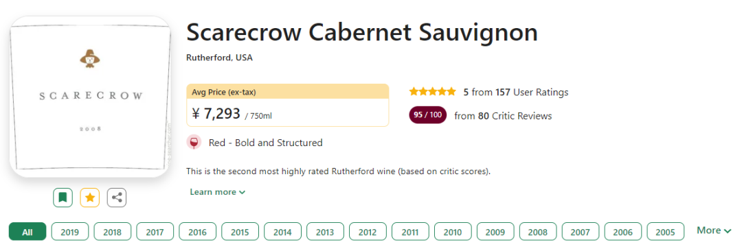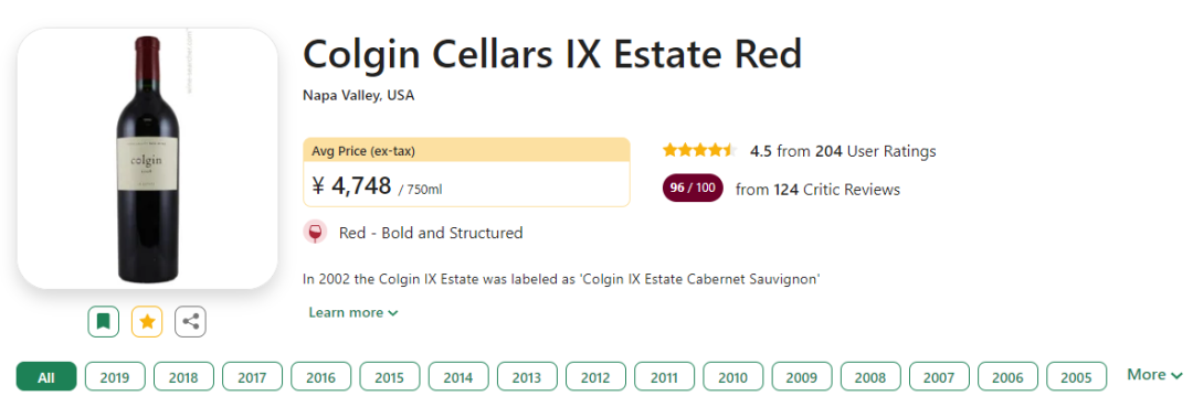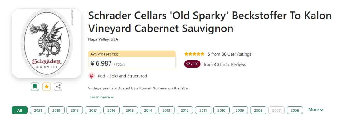 首个年份1992年刚发布便获得了RP99分的成绩,RP称赞是他喝过的最优秀的年轻赤霞珠之一,随后1997、2007、2010与2012年份均获得了RP满分好评。