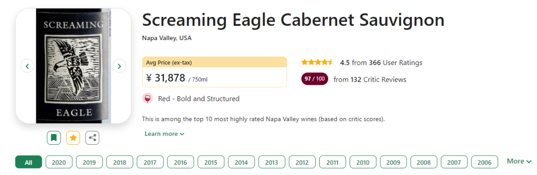 2000年,一瓶6升装的1992年份啸鹰赤霞珠干红葡萄酒在纳帕谷葡萄酒拍卖会上以500,000美元(≈3378000人民币元)的高价售出,令人叹为观止。