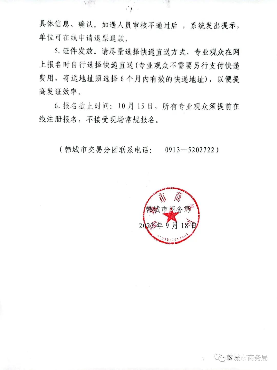 5.证件发放。请尽量选择快递直送方式,专业观众在网上报名时自行选择快递直送(专业观众不需要另行支付快递费用,寄送地址须选择6个月内有效的快递地址),以便提高发证效率。