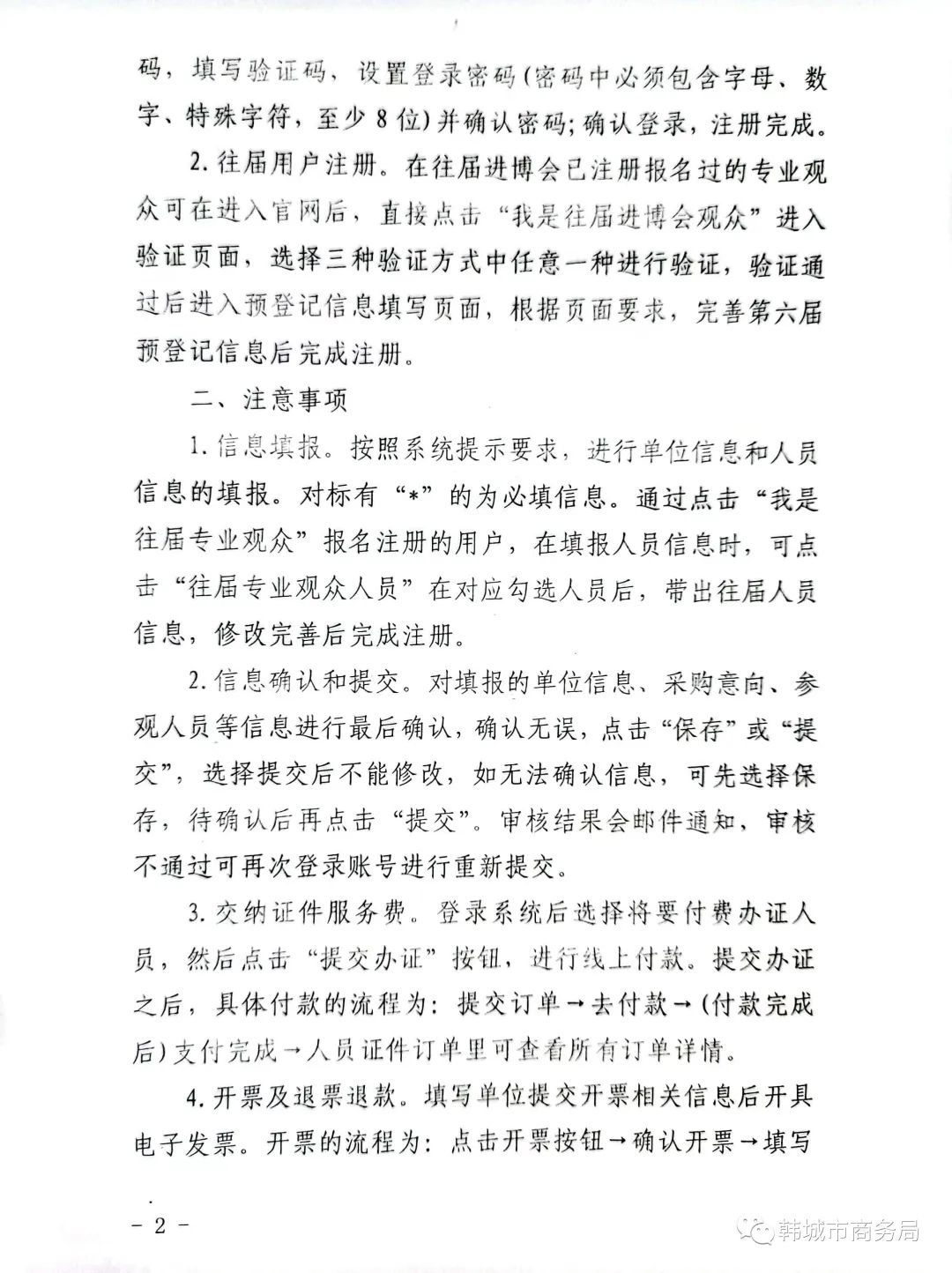 1.新用户注册。专业观众来源分为企业、政府机构、事业单位、社会组织。参会单位可登录官网报名(网址:www.ciie.org)或扫描二维码(报名二维码见文未),进入在参观预登记选项下进行注册:选择“单位所在地区”,选择单位及对应的选项;点击新用户注册后输入单位的“统一社会信用代码”和陕西省交易团邀请码Q2021153(扫描二维码进入的无须填写);进入下一步输入手机号,点击发送验证码,填写验证码,设置登录密码(密码中必须包含字母、数字、特殊字符,至少8位)并确认密码;确认登录,注册完成。