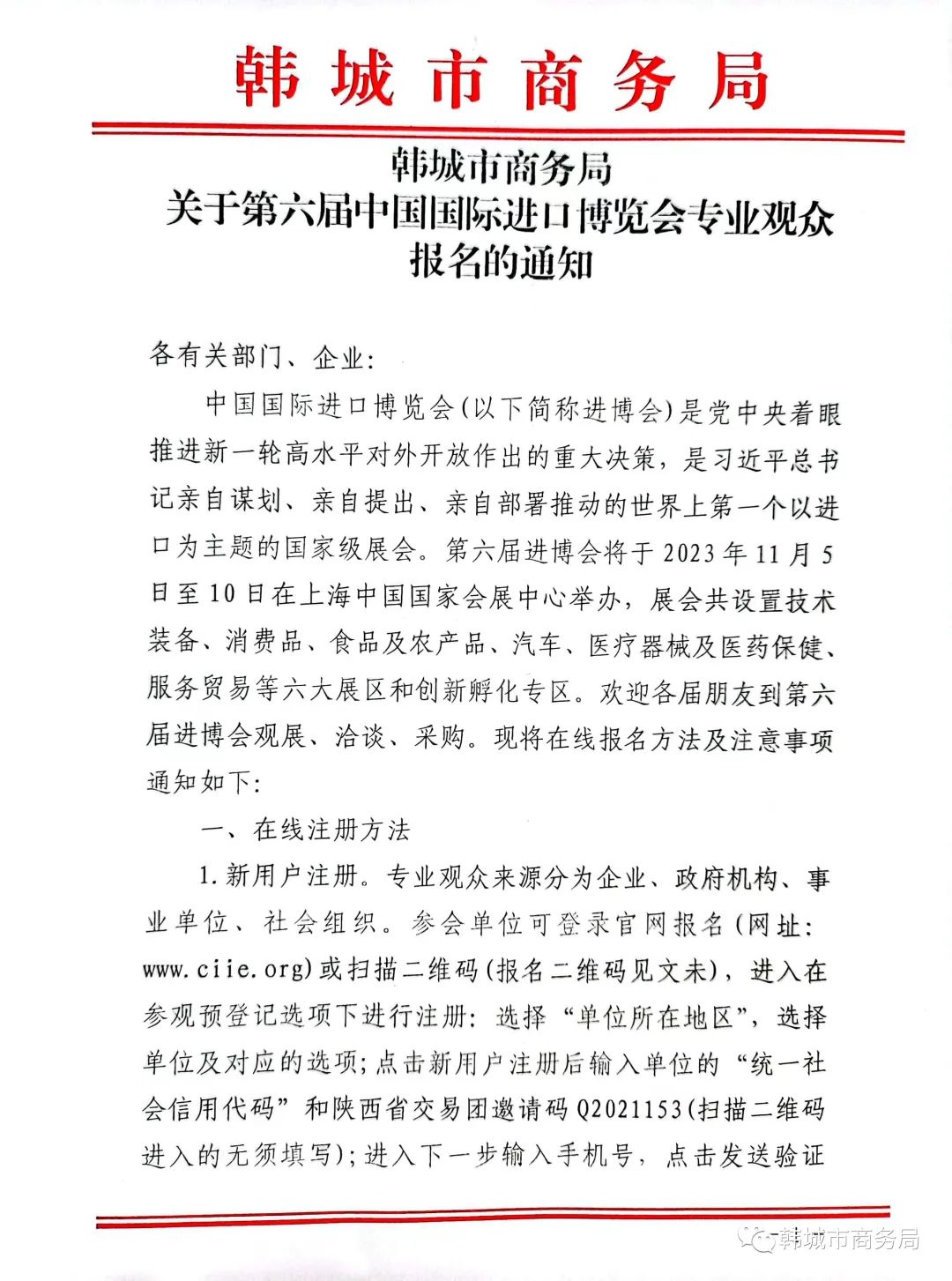 中国国际进口博览会(以下简称进博会)是党中央着眼推进新一轮高水平对外开放作出的重大决策,是习近平总书记亲自谋划、亲自提出、亲自部署推动的世界上第一个以进口为主题的国家级展会。第六届进博会将于2023年11月5日至10日在上海中国国家会展中心举办,展会共设置技术装备、消费品、食品及农产品、汽车、医疗器械及医药保健、服务贸易等六大展区和创新孵化专区。欢迎各届朋友到第六届进博会观展、洽谈、采购。现将在线报名方法及注意事项通知如下: