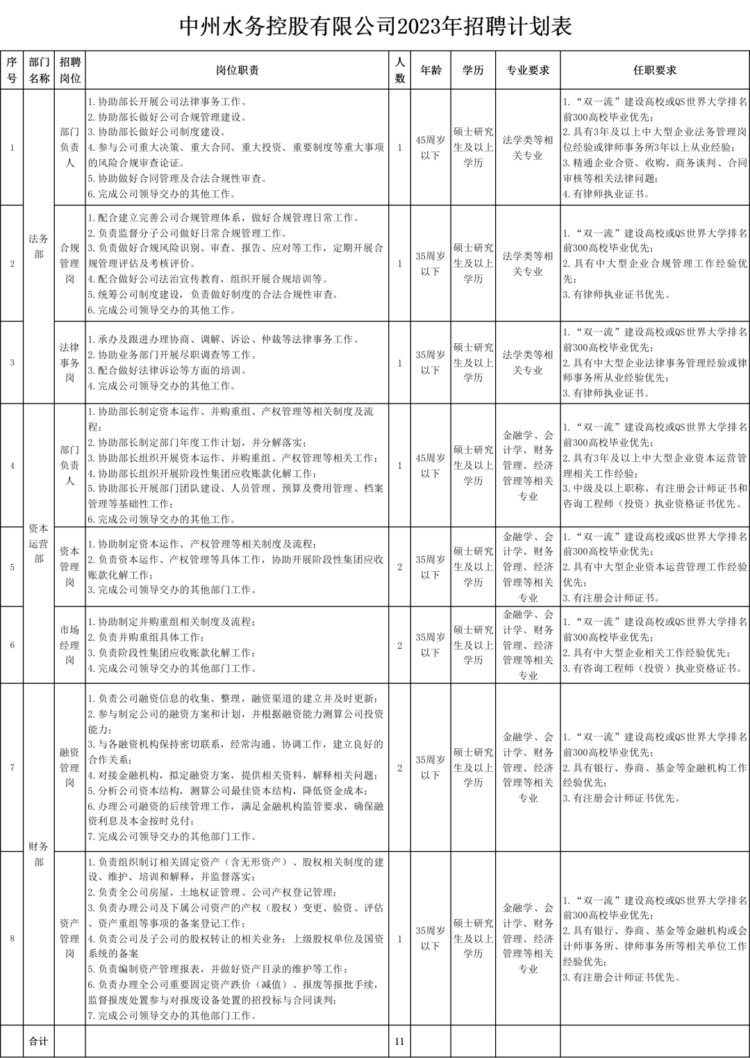为适应公司业务快速发展需要,实现人员科学配置和快速充实到位,现特制定中州水务控股有限公司2023年社会招聘公告。本次面向社会公开招聘11人,岗位详情见最下方附件:中州水务控股有限公司本部2023年招聘计划表。1.具有中华人民共和国国籍,热爱祖国,政治立场坚定,拥护党的路线、方针、政策,遵守国家的法律、法规;2.根据招聘要求具备对应的学历,并取得各阶段相应的学历、学位证书,留学归国人员应取得中华人民共和国教育部留学服务中心的学历、学位认证;3.具有良好的职业素养,忠诚敬业、开拓进取、创新意识强、有较强的事业心和责任感,具有胜任岗位的专业技术能力、创新能力、组织协调能力、文字写作能力和语言表达能力;4.品行端正,具备良好的职业道德,无违规违纪违法等不良记录;(2)刑罚尚未执行完毕或属于刑事案件被告人、犯罪嫌疑人,司法机关尚未撤销案件、检察机关尚未作出不起诉决定或人民法院尚未宣告无罪的人员;(3)尚未解除党纪、政纪处分或正在接受纪律审查的人员;(5)人民法院公布的失信被执行人或被依法列为失信联合惩戒对象的;(6)国家有关部委联合签署备忘录明确的失信情形人员;应聘者只能选择公司1个岗位进行申报。提交的相关信息和材料必须真实、准确、完整、合法、有效。凡不按要求提交信息和材料者,一经发现,立即取消资格。1.报名截止时间:2023年9月26日18:00。2.报名方式:报名采取网上报名的方式,符合报名条件的招聘对象需登录zzsw2023.zhaopin.com网站,进行注册并在线报名。(3)各阶段学信网《教育部学历证书电子注册备案表》,(国(境)外学历人员此项为《国外学历学位认证书》扫描件);各阶段学信网《中国高等教育学位在线验证》,(国(境)外学历人员此项为《国外学历学位认证书》扫描件。1.公司将根据岗位任职要求对应聘者进行资格审查。资格审查贯穿公开招聘工作全过程,在任何一个环节发现资格不符或弄虚作假的,均取消应聘及录用资格。如出现特别优秀者可向招聘小组申报,经研究同意后可适当放宽条件。2.资格初审不合格的,不能参加综合考评。经资格审查后未能达到1:10竞争的岗位,可终止后续招聘程序。3.应聘者应确保联系方式填写准确,通信工具畅通。在各招聘环节中,将及时通知进入下一环节的应聘者,如若联系不到考生本人,则视为考生自动放弃资格。招聘分为笔试和面试两个环节,满分均为100分,具体时间、地点、方式另行通知,请注意保持手机畅通。笔试以闭卷方式进行,内容包含综合知识和专业知识,由行政能力测试和专业能力测试两部分组成。若考生在接到笔试通知后,明确表示放弃参加考试的,其名额自动作废,不再递补。面试将根据应聘人员的笔试成绩从高到低排名确定人选,面试比例原则上不低于1:5,笔试成绩并列者,一并进入面试。面试相关安排将另行通知,请保持通讯工具畅通。如报名应聘人员放弃面试资格,将按成绩从高到低的顺序依次递补。综合成绩计算方式:综合成绩=笔试成绩×40%+面试成绩×60%。根据报名应聘人员所报岗位总成绩从高到低的顺序,1:1等额比例确定参加体检和背调的人选。背景调查委托第三方机构进行,结果以背景调查报告为准。如出现本人放弃入职体检或背景调查以及入职体检或背景调查不合格被取消录用资格的情况,顺延至下一位候选人(最多顺延至第3名;同一个岗位招聘2人的,最多顺延至前4名)。如遇岗位调剂等特殊情况的,报招聘领导小组研究决定。根据体检结果和考察情况等,择优确定拟聘用人员,进行公示,公示时间为5个工作日。经公示无异议的拟聘人员,按照相关规定办理入职手续,签订劳动合同、保密协议等。薪酬福利待遇等按公司相关制度规定执行,包括:缴纳六险两金,享受国家规定的年休假、劳动保护,各项培训学习活动等。(一)本次招聘不收取报名费、手续费等任何费用。公司从未成立或委托成立任何考前辅导、考前押题等类似机构,从未编辑并印发考试大纲或应试参考资料,也从未向任何机构提供招聘考试的资料,请应聘者切勿相信虚假广告宣传,如有机构发布有关的攻略及考前培训信息,均与公司无关。请应聘者提高警惕,防止受骗。(二)公司将对报名资料严格保密,恕不退回。应聘者应对提交资料的真实性负责并承担相应责任。(三)请应聘者保持所提供的通讯方式畅通,综合考核、背景调查、体检等环节具体要求将通过手机短信发送,未进入下一环节的不再另行通知。因应聘者本人原因未获知相关信息而影响考试或聘用的,责任由应聘者自行承担。(四)最终录用人员实行试用期管理,试用期考核合格,将按有关规定办理转正手续;如试用期考核不合格,公司将按相关管理制度规定与员工解除劳动合同。(五)未尽事宜,中州水务控股有限公司具有最终解释权。
