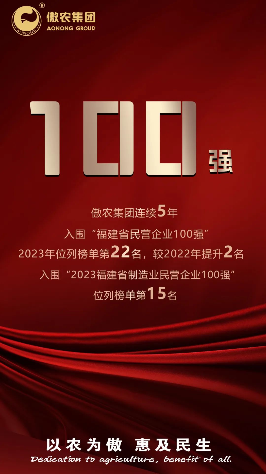9月19日,福建省工商联发布2023福建省民营企业100强、2023福建省制造业民营企业100强、2023福建省创新型民营企业100强、2023福建省服务业民营企业100强4个榜单,这是福建省工商联连续第6年发布福建省民营企业100强榜单。傲农集团荣登2023福建省民营企业100强2023福建省制造业民营企业100强两大榜单,分别位列榜单第22位和第15位