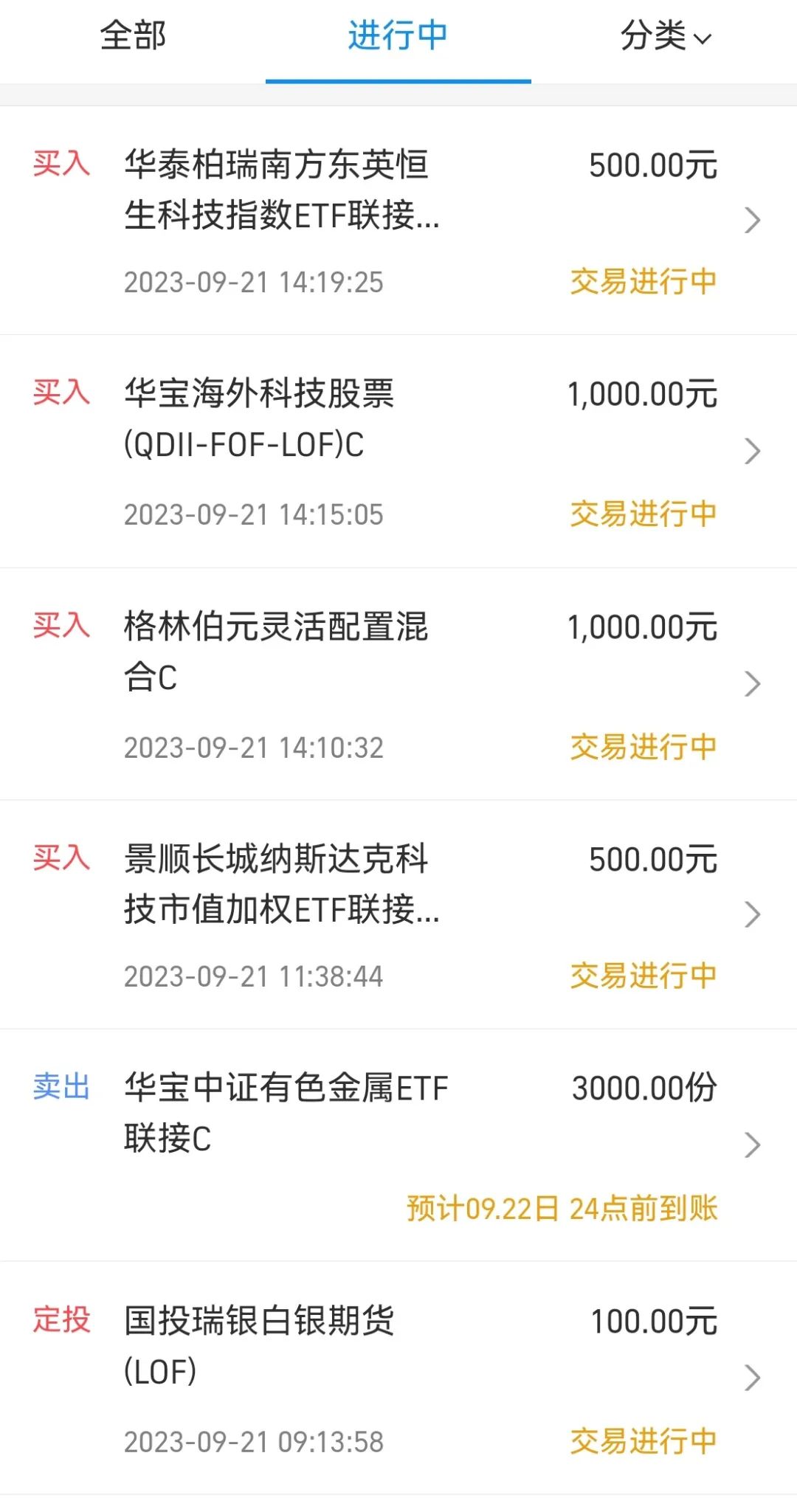 加仓 恒生科技 500元,接近3800点开始慢慢定投。加仓木头姐的华宝海外科技1000(初创美国科技公司),加仓景顺长城纳指科技(大型科技公司)500;减仓有色金属3000,有色金属打野时设置了止损点,这个位置破了止损点止损出场。等下一次机会。