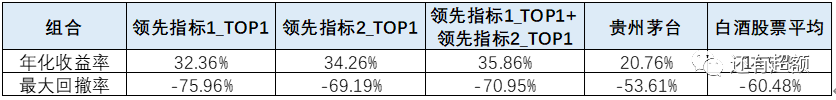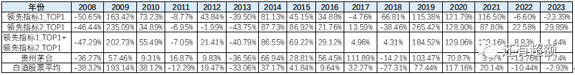 因此,选取中信白酒指数(CI005324.WI)的成分股作为样本池,分别根据最新一期“领先指标1”和“领先指标2”的同比变化值各选取降序排列的第一个股票,与样本池平均、贵州茅台的表现进行对比。从以下净值走势、全时间表现统计及各年收益率来看,可以发现这两个指标在长期来看都有较好的选股效果。
