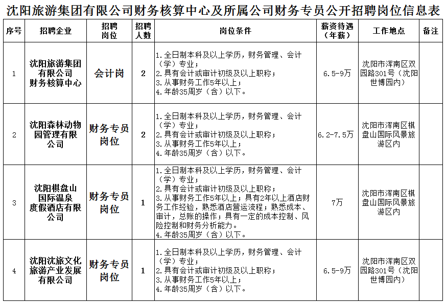 具体岗位及薪资待遇详见《沈阳旅游集团有限公司财务核算中心及所属公司财务专员公开招聘岗位信息表》(附件1)(见文中最下方)。