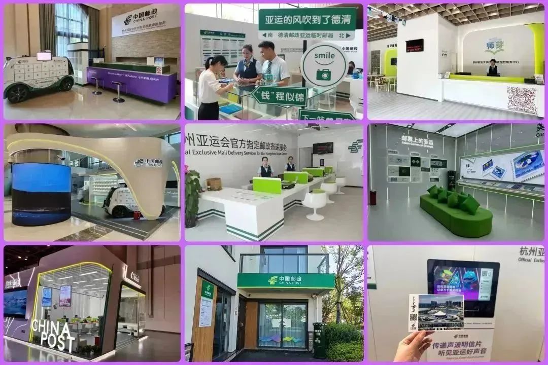 中国邮政打造16处临时邮局,展览集邮类、封片卡类等,展示邮政中的“亚运形象”,提供文件、物品寄递服务,满足杭州亚运会的用邮需求。