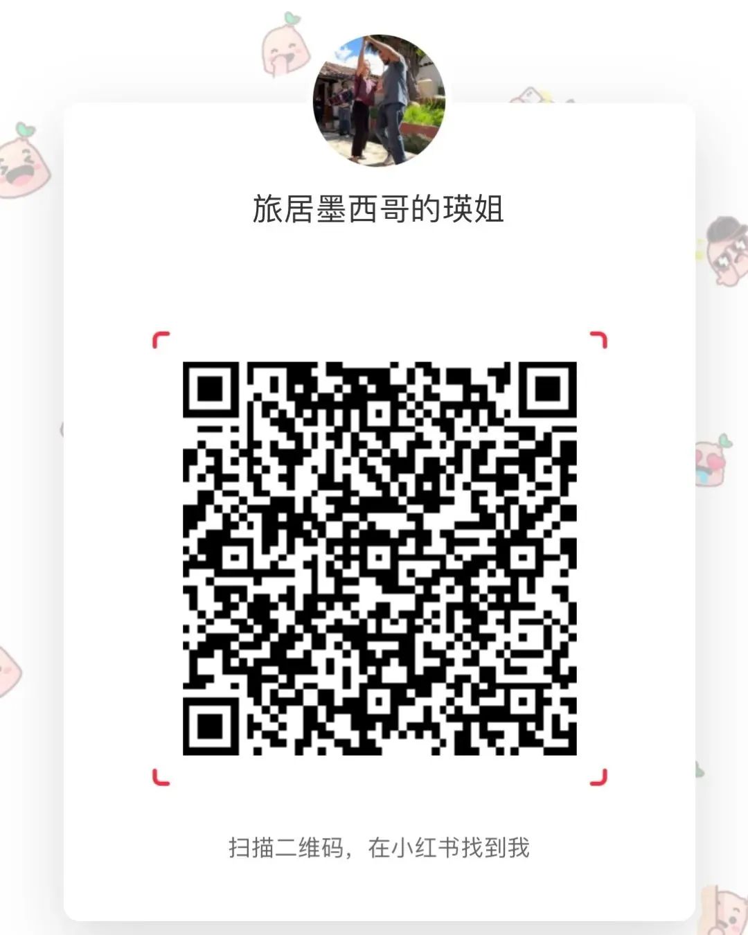 欢迎大家在小红书平台搜索「旅居墨西哥的瑛姐」或扫描下方二维码,关注瑛姐。每周瑛姐会和大家分享旅居生活vlog和大大小小的日常趣事~如果你对墨西哥或瑛姐的生活有任何好奇,也欢迎在小红书评论区直接给瑛姐留言!