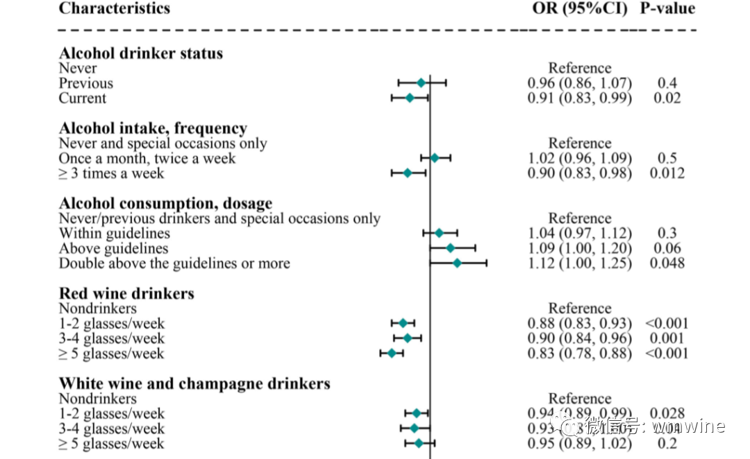 该研究的作者写道,这项研究包括473957名受试者,其中16559人的新冠检测呈阳性。研究人员为受试者每周的饮酒量制定了指导方针,分为四种不同类别,包括少于14单位的饮酒量,超过14单位的饮酒量,少于28单位的饮酒量和大于28单位的饮酒量。与不喝酒的人相比,每周饮用超过280ml红酒(1-2杯),降低10%-17%的新冠病毒感染风险,喝白葡萄酒和香槟的风险降低了7-8%。然而,喝啤酒和苹果酒的人感染新冠病毒的风险增加了28%。研究表明,无论饮酒频率如何,每周1-2杯红酒对新冠的保护作用都是显著的,然而,啤酒和苹果酒的消费增加了新冠的感染风险,不建议饮用。