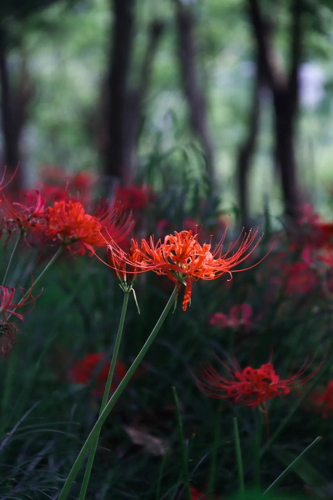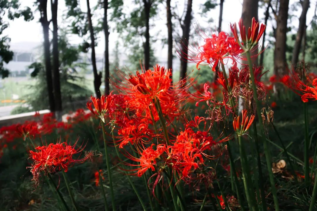 “彼岸花开,花开不见叶,叶生不见花,相念相惜不相见”,故名曰彼岸花,盛开的彼岸花是娇艳的红色,成片绽放后有一种神秘的美。