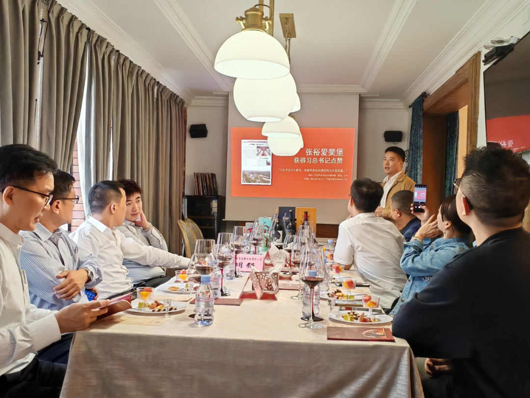 在名酒品鉴环节,主持人向嘉宾热情地介绍了两家公司的自主品牌张裕爱斐堡、郡之酱和安第斯微岚,并分别将各自品牌旗下五款酒的产地、酿造工艺、口感和风味等特点娓娓道来。