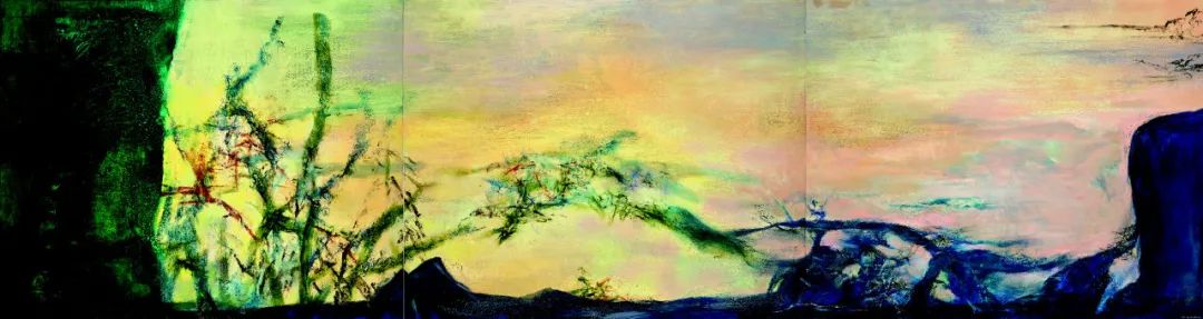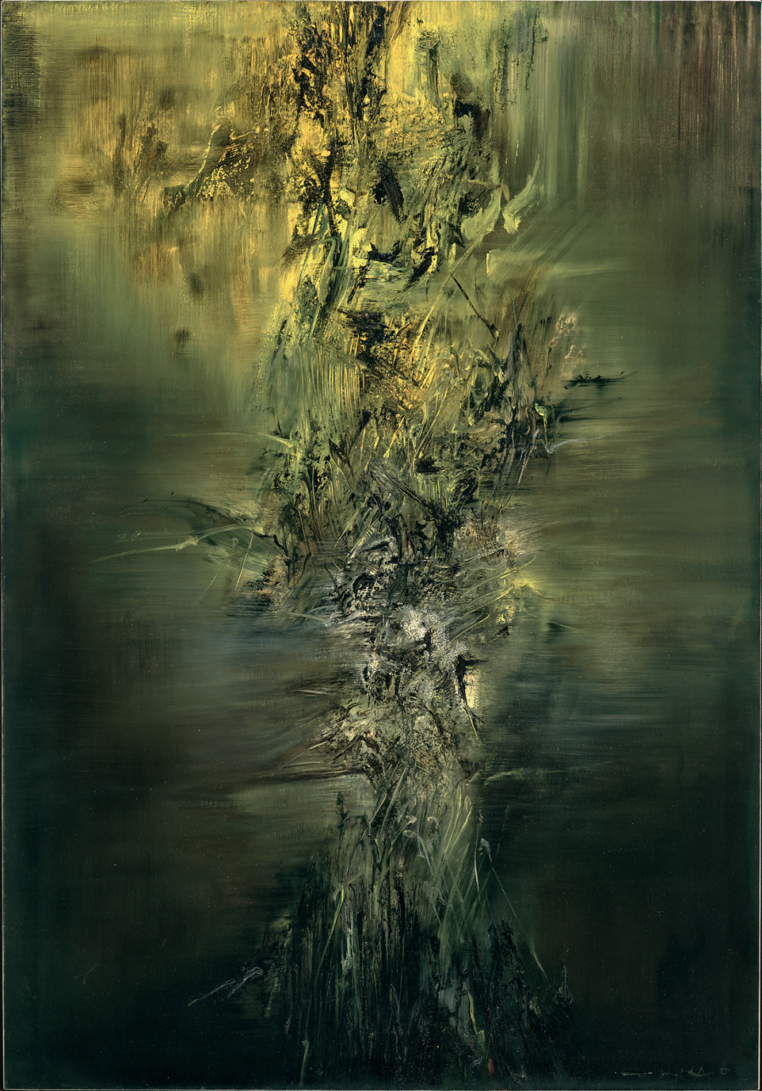 20世纪60年代,他从形象和字符中解脱出来,以表现主义的狂飙涂抹响应草书的笔势与章法,将自己抛入绘画之中。至此,他的创作逐渐演化为一场肉身与画布搏斗的行动,在自发性的书写挥洒中,逐渐生长出抽象山水意象。