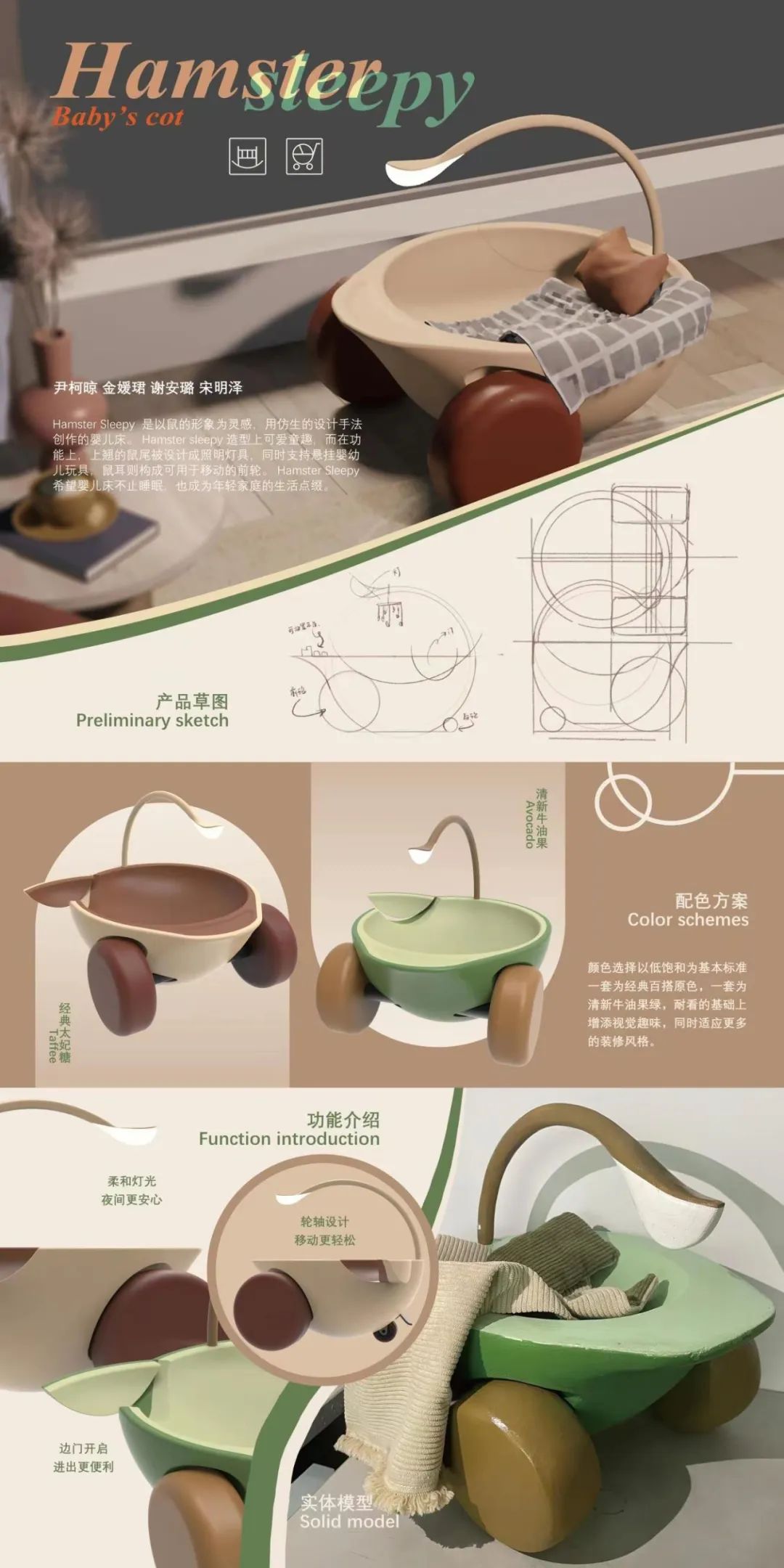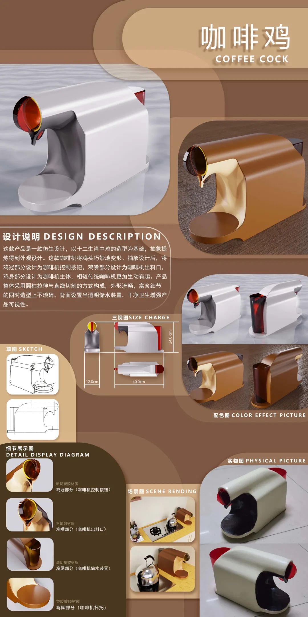 设计说明:咖啡机整体造型根据母鸡孵蛋的动态,进行仿生设计。该设计可以激起农村出生长大后在城市生活的人们想起童年农村的朴素和真挚,每一杯咖啡,都是冰冷混凝土森林中,早晨的一杯自然。