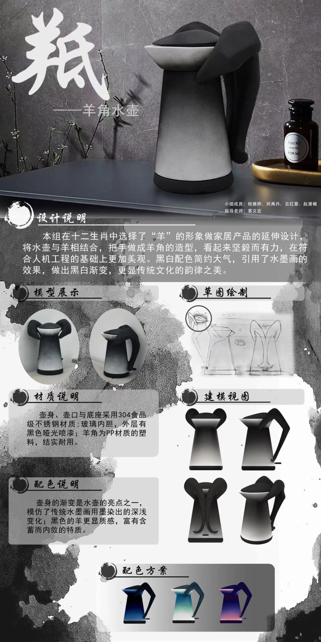 设计说明:以“羊”的形象延伸设计,将水壶与羊的特征结合。把手呈现羊角状,更显坚毅有力,满足人机工程的同时赋予产品美观性。黑白配色,引用了水墨画晕染渐变效果,使水壶更富有韵律之美。