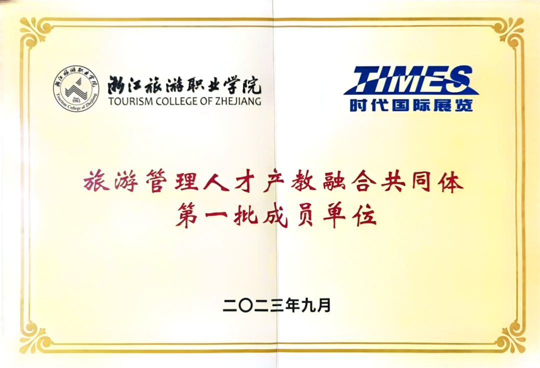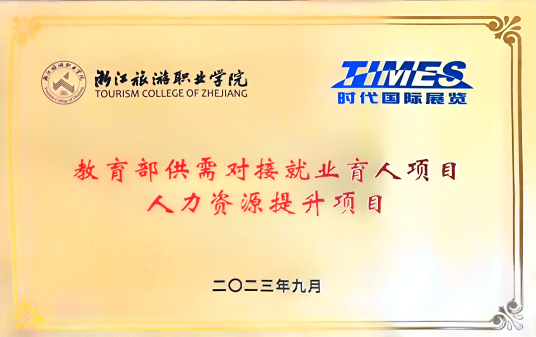 在浙江省旅游投资集团的支持下,由浙江时代国际展览服务有限公司发起与浙江旅游职业学院、浙大城市学院、杭州师范大学等10余所高等院校共同成立“旅游管理人才产教融合共同体”。2023年4月,教育部高校学生司公布第二期供需对接就业育人项目,我院会展策划与管理专业获浙江时代国际展览服务有限公司人力资源提升项目。浙江时代国际展览服务有限公司为教育部协同育人项目、教育部就业育人项目、首批共同体成员单位授牌。