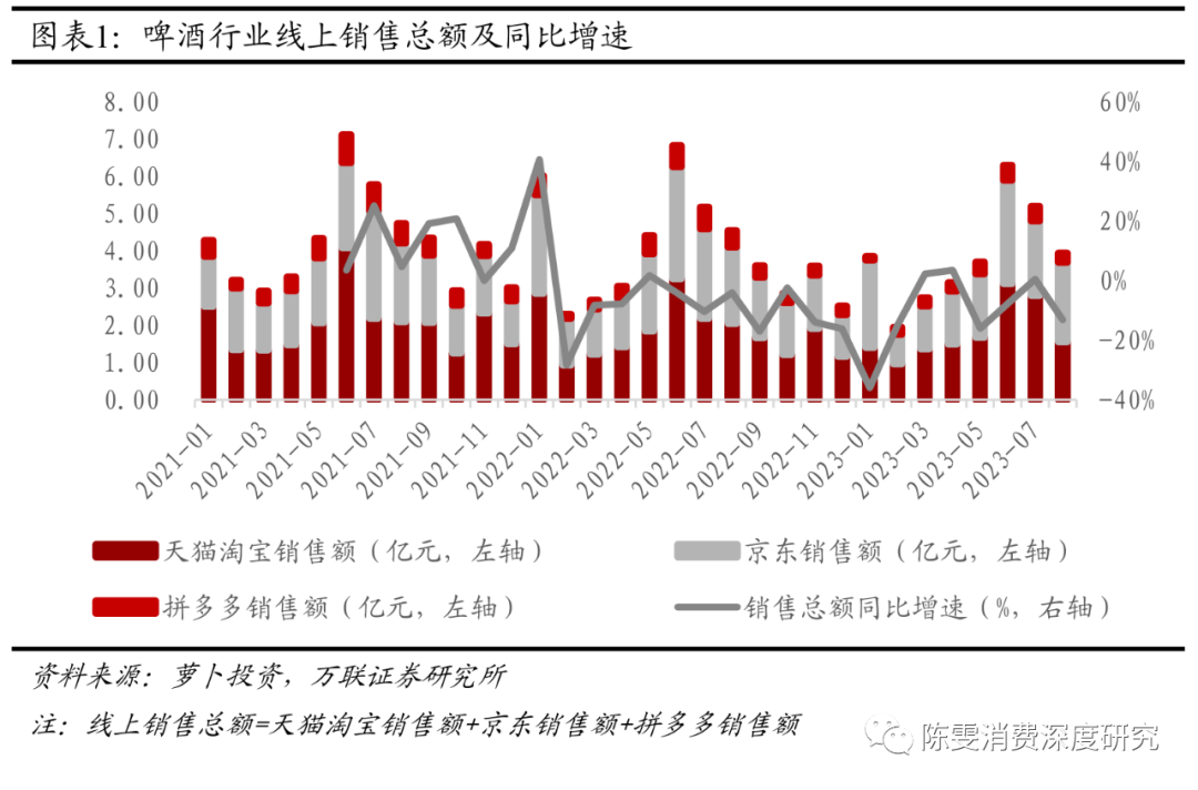 1.1 啤酒线上销售额同比由正转负,京东销售额占比过半