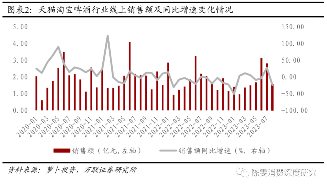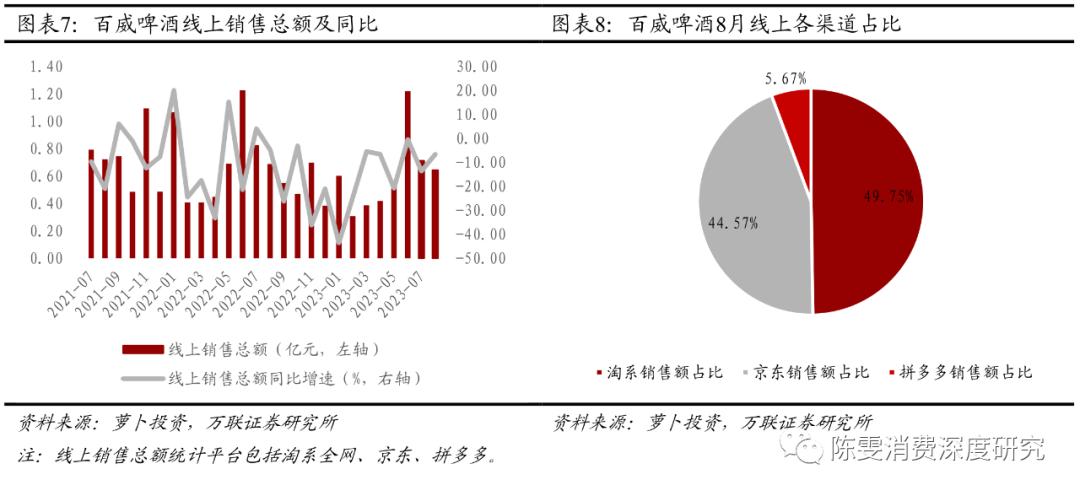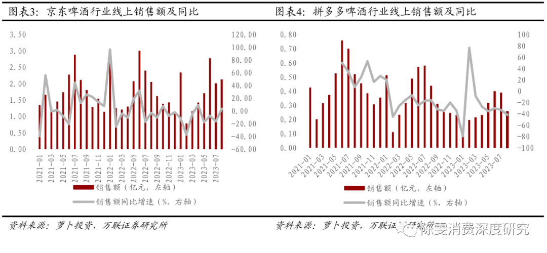 京东线上销售额同比增速由负转正,拼多多同比跌幅持续扩大。根据萝卜投资数据,8月淘系平台啤酒线上销售额为1.56亿元(YoY-23.98%),同比增速较上月(YoY+27.60%)下滑严重。京东啤酒销售额为2.13亿元(YoY+3.59%),同比增速较上月(YoY-16.20%)由负转正。拼多多啤酒销售额为0.26亿元(YoY-41.66%),同比增速较上月(YoY-33.00%)跌幅持续扩大。
