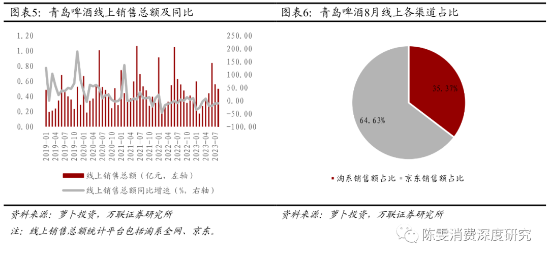 8月青岛啤酒线上销售额同比负增长,京东渠道优势明显。根据萝卜投资数据,8月青岛啤酒淘系平台与京东线上销售总额为0.50亿元(YoY-10.38%),同比增速较上月(YoY-10.90%)近乎持平。本月淘系平台与京东销售额占比差距明显,8月淘系平台/京东线上销售额分别为0.18/0.32亿元,占比分别为35.37%/64.63%。
