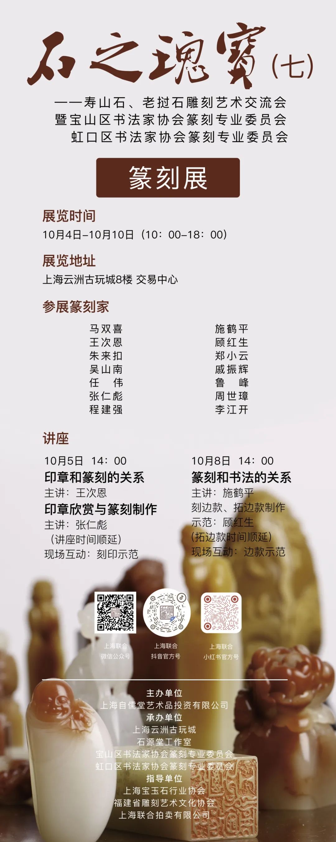 由上海自儒堂艺术品投资有限公司主办,石源堂工作室、云洲古玩城、宝山区书法家协会篆刻专业委员会、虹口区书法家协会篆刻专业委员会承办,上海宝玉石行业协会、福建省雕刻艺术文化协会、上海联合拍卖有限公司为指导单位的“石之瑰宝(七)——寿山石、老挝石大师雕刻艺术作品展”将于10月4日至10日在云洲古玩城八楼交易中心隆重开幕。
