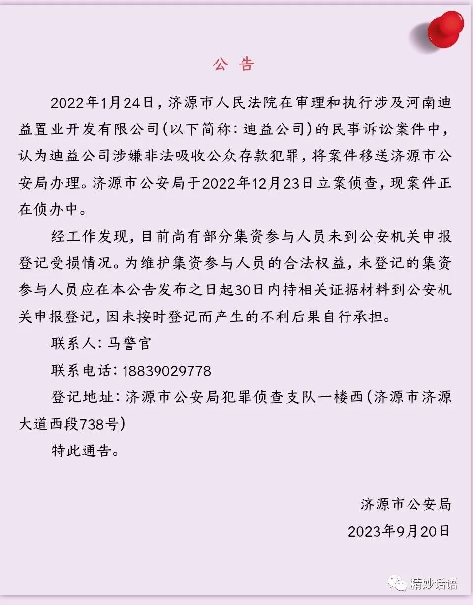 2023年9月20日,济源市公安局对外发布了关于河南迪益置业开发有限公司涉嫌非法吸收公众存款案的情况通告。具体如下: