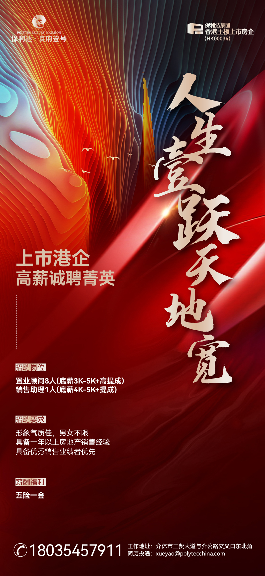因发展需求,现诚聘酒水业务员10名,男女不限,年龄22岁以上,对工作要有责任心,无不良嗜好,无重大疾病。吃苦耐劳,服从安排。?酒水饮料销售经验者优先录用。工作时间自由,工作轻松。底薪3600+提成(综合薪资12000+)工作地点介休市!有意者电话联系!刘先生:17735478587赵先生:17534988493