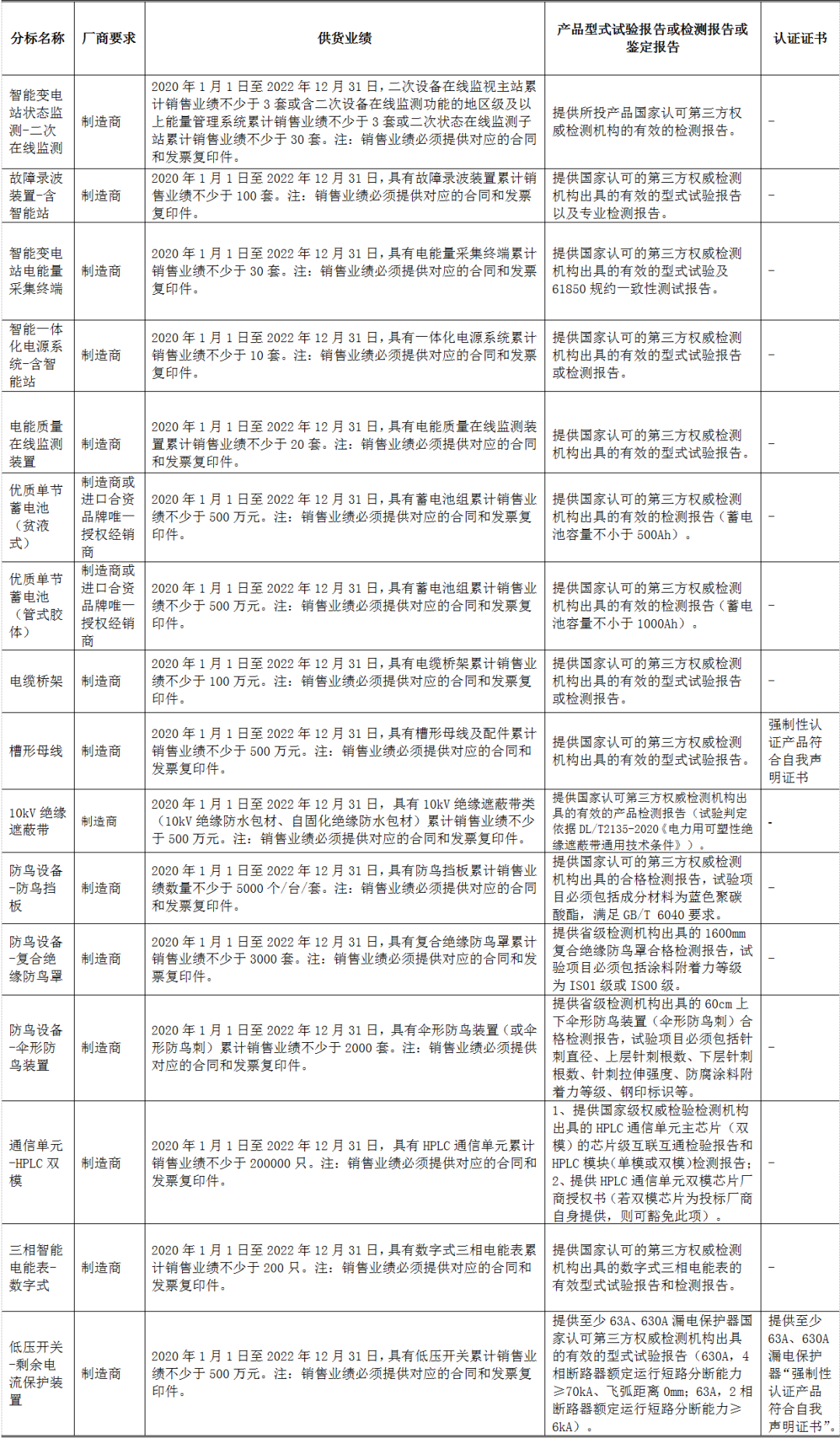 国网山东省电力公司2023年第二次配网物资协议库存招标采购项目招标公告项目建设单位为国网山东省电力公司或其所属单位(以下简称“项目单位”),项目资金来自企业自有资金,出资比例为100%,资金来源已落实,招标人为国网山东省电力公司,并委托山东恒瑞招标代理有限公司为招标代理机构。项目已具备招标条件,现对该项目进行公开招标。各分标专门资质业绩要求事项及其数据、状态分别如下:以下分标需提供包含相应技术参数的有效的型式试验报告、检测报告(若相关分标的补充资格要求提供的型式试验报告、检测报告能包含以下技术参数,则不需要额外提供)4.2凡有意参加投标者,请于招标公告发布之日起至2023年9月28日17时(北京时间,下同),登录招标人招投标交易平台信息系统(国家电网有限公司电子商务平台https://ecp.sgcc.com.cn,以下简称电子商务平台)获取招标文件5.1 投标文件提交截止时间(投标截止时间,下同)为2023年10月15日19时。投标文件提交时间:所有投标文件应当在投标截止时间前递交(提交)招标人。
