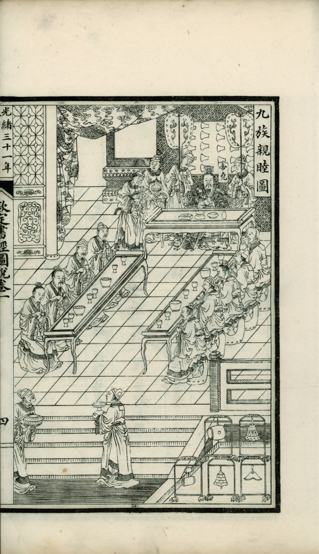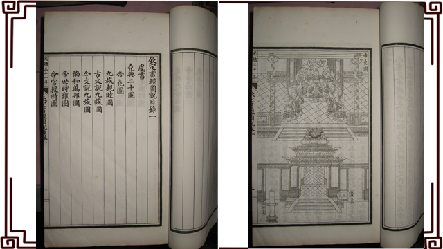 《欽定書經圖說五十卷》此书系清光绪二十九年孙家鼐、张百熙等奉慈禧太后之旨纂辑,交京师大学堂编书局,延聘江南画师,凡有事实可图者,遂自为图。以三十一年成书刊行,派讲官轮班进讲。以图为主而系之以说。其地理诸图,本清儒胡渭《禹贡锥指》,而人物衣冠以及器用,则依据晋顾凯之《列女传图》,宋聂崇义《三礼图》及明张居正《帝鉴图说》。光绪癸卯甲辰间,命南书房翰林撰《书经图说》,按日呈览,书成颁行。丁未冬,又派儒臣七人轮班进讲,孝钦及德宗每日办事後,听讲於勤政殿。”全书共有版图五百七十幅,图绘工致,版印精能,而楼台界画,人物勾勒,穷态极妍,犹见北宋遗规。