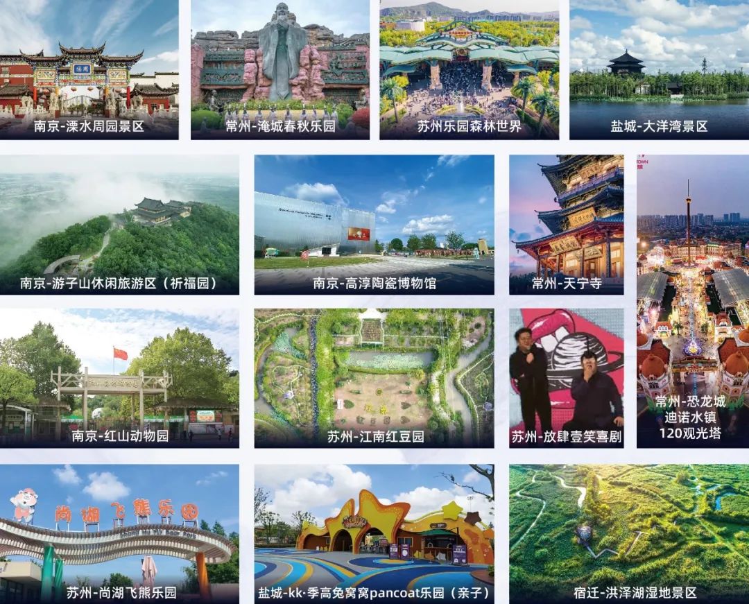 还有一大批新加入的景区,包括南京溧水周园、游子山休闲旅游区、喜马拉雅沃德冰雪世界,常州天宁寺、恐龙城迪诺水镇120观光塔,苏州江南红豆园、尚湖飞熊乐园,盐城KK•季高兔窝窝PANCOAT乐园、大洋湾生态旅游景区,宿迁洪泽湖湿地景区等。