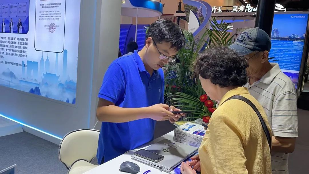 来到运河特色旅游产品展的数币生活体验馆,领导嘉宾一行听取了江苏水韵文化旅游运营有限公司有关“水韵江苏”数字旅游卡上线一年来的成果汇报。