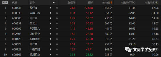 上图:片仔癀、同仁堂由于其强大的品牌影响力,其市盈率略微偏高,其他估值应该都还不错。