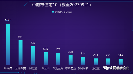 上图:中药企业市值过千亿的只有片仔癀一家,云南白药还在千亿附近徘徊