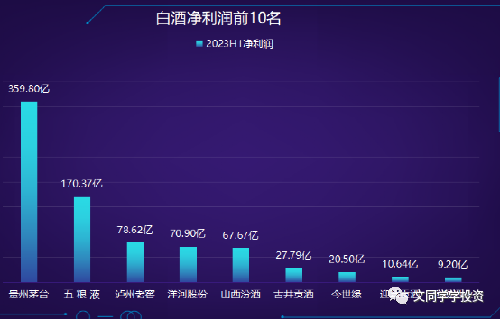 上图:白酒板块,贵州茅台独领风骚,上半年净利润高达360亿;五粮液也以170亿的净利润稳居第二。