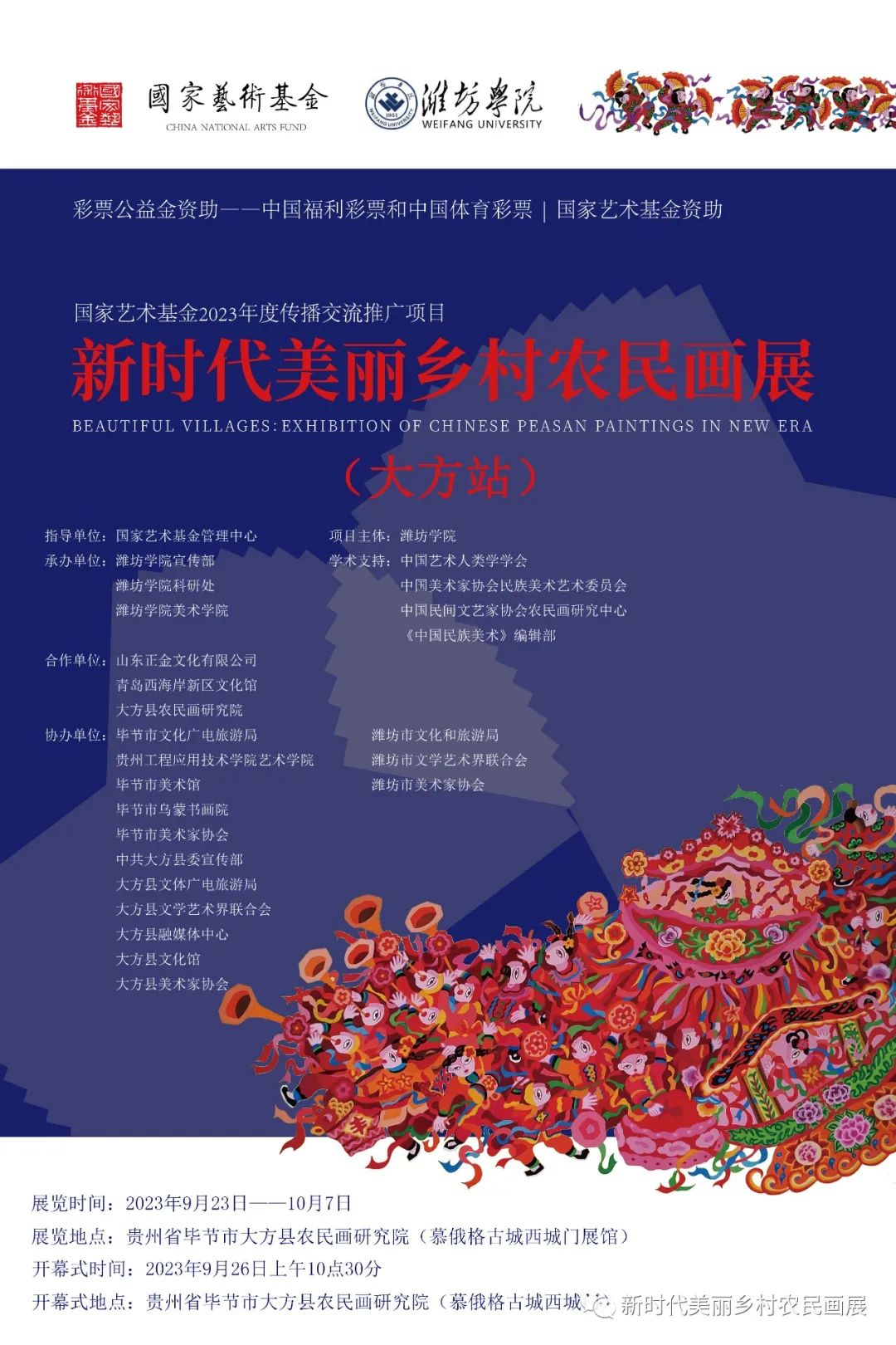 国家艺术基金 2023 年度资助项目“喜迎二十大 · 奋进新时代——新时代美丽乡村农民画展”由潍坊学院主办,潍坊学院宣传部、科研处、美术学院承办,该项目以新时代农民画作品为展览内容,从产业兴旺、生态宜居、乡风文明、治理有效、生活富裕五个维度进行展示。展览将展出全国多地农民画作品 160 余幅,将于 2023年 6 月至 10 月先后在山东、云南、贵州、北京等地进行巡回展览。展现农民画新成就,展现乡村振兴新成果。