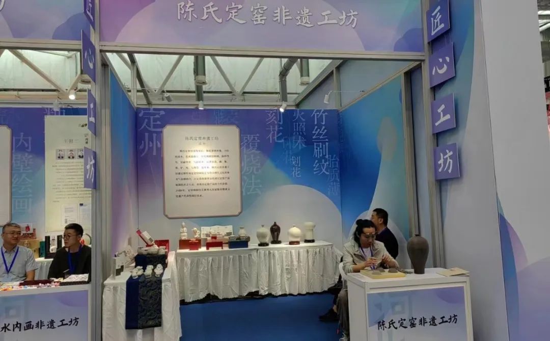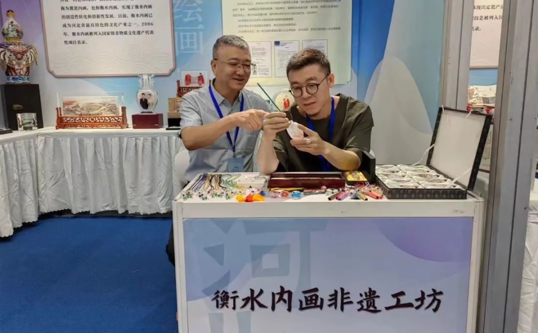 在运河非遗展主题展区,集中展示了大运河沿线8省市具有鲜明地域特色、独特制作技艺和深厚文化内涵的非遗资源,以及非遗助力乡村振兴的丰硕成果和优秀案例。河北丰宁满族剪纸、魏县花布染织技艺、唐山孙氏银器制作技艺、黄骅面花制作技艺、永清秸秆扎刻等5个项目,以及衡水内画、曲阳定瓷、定兴京绣等3个优秀非遗工坊项目参展,受到观众和社会各界的一致好评,各项目在展示文化技艺和品牌形象的同时,还热销产品并与相关方积极交流互鉴、恳谈合作意向,取得了经济效益和社会效益“双丰收”。衡水内画代表性传承人王自勇热情介绍内画精湛的绘制技艺和鼻烟壶文化,宣传推介其依托内画艺术博物馆和内画工坊拉动文旅消费、促进研学旅游、助力乡村振兴的理念做法,受到各界关注。丰宁满族剪纸代表性传承人石俊凤现场剪制人物肖像,吸引观众纷纷驻足围观和踊跃参与体验,一位外宾在完成剪纸肖像制作后,激动地说“中国文化,great”。