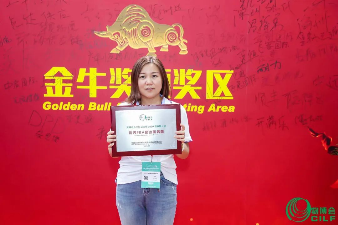 展会期间,乐丰联运荣获第17届中国物博会金牛奖。9月22日,主办方我司授予“优秀FBA物流服务商”称号。作为受表彰企业,市场部经理Emily代表乐丰联运参与了本次表彰。