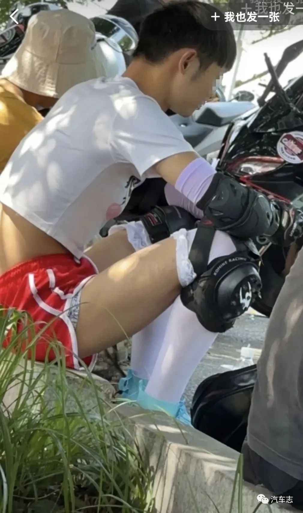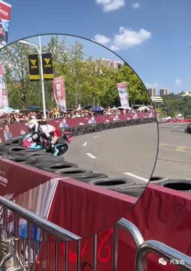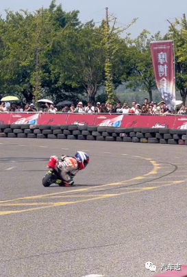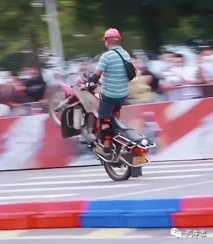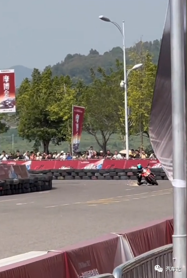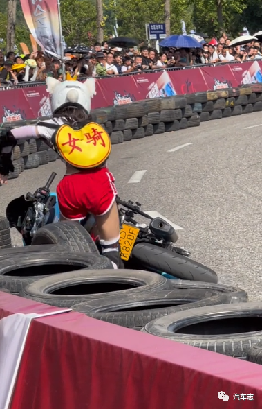 这位外卖小哥去年摩博会就曾凭借精彩的压弯获得阵阵喝彩,没想到今年表现更上一层楼。另外一位“馒头哥”也在摩博会大放异彩,虽然骑的是普通的125跨骑,但其凭借精彩的车技获得了观众的掌声。压弯肯定是有风险的,今年重庆摩博会的首摔来的比以往更早一些。一位骑着蒂芙尼蓝色春风250SR的长发骑士在压弯时操作失误,撞上了轮胎墙,好在人和车都没事。这位骑士背着一个圆形背包,上面写着“女骑”二字,不过有网友爆出图片称该骑士其实是男扮女装。(视频来自@mx926927)