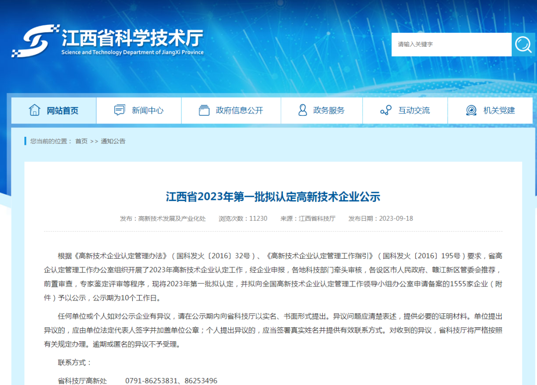 根据《高新技术企业认定管理办法》(国科发火〔2016〕32号)、《高新技术企业认定管理工作指引》(国科发火〔2016〕195号)要求,省高企认定管理工作办公室组织开展了2023年高新技术企业认定工作,经企业申报,各地科技部门牵头审核,各设区市人民政府、赣江新区管委会推荐,前置审查,专家鉴定评审等程序,现将2023年第一批拟认定,并拟向全国高新技术企业认定管理工作领导小组办公室申请备案的1555家企业(附件)予以公示,公示期为10个工作日。