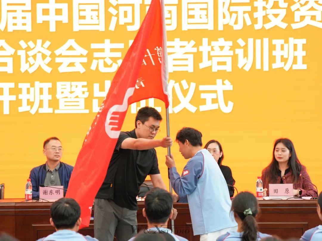 为贯彻落实省政府常务会议和省领导指示精神,以办会质量体现河南风采,以项目合作体现实际成效,围绕重点产业集群培育,着力引进一批好企业、好项目,把河南投洽会办出成效、办出特色、办出水平,进一步提高本次会议志愿者的综合素质和能力,更好地为会议服务,9月23日,第十四届中国河南国际投资贸易洽谈会志愿者培训班开班暨出征仪式在我校龙子湖校区力行楼报告厅举行。团省委权益和社会工作部部长樊宸雨、省商务厅机关党委三级调研员周亚丽、校团委副书记谢东明、院团委书记田原出席开班仪式,培训班指导教师及我院100名青年志愿者参加了开班仪式。开班仪式由田原主持。
