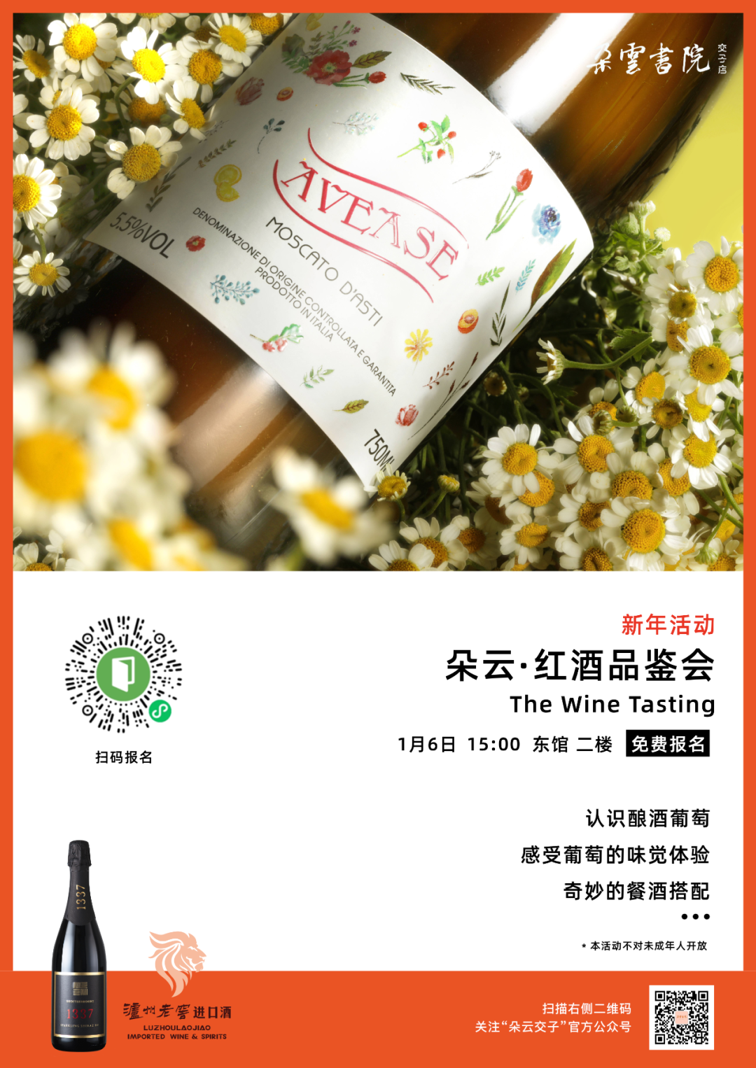 朵云书院·交子店新年特别活动,携手“泸州老窖进口酒”带来红酒品鉴会。在朵云书院品味一杯红酒的故事,探索红酒的历史,感受神奇的味觉体验,发现奇妙的餐酒搭配,活动免费参与。