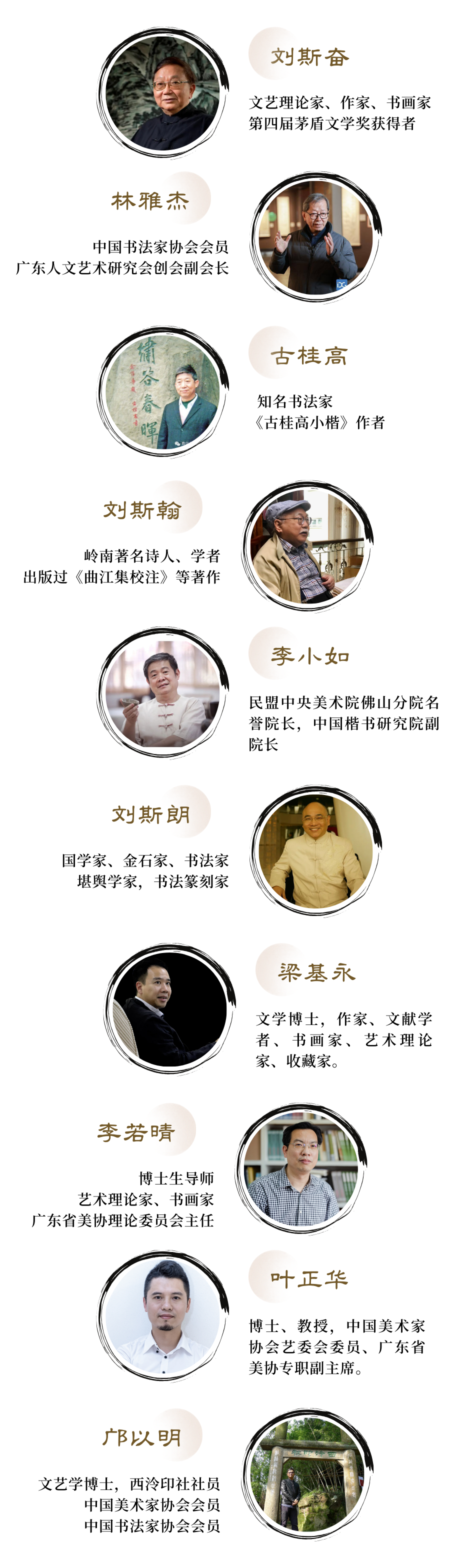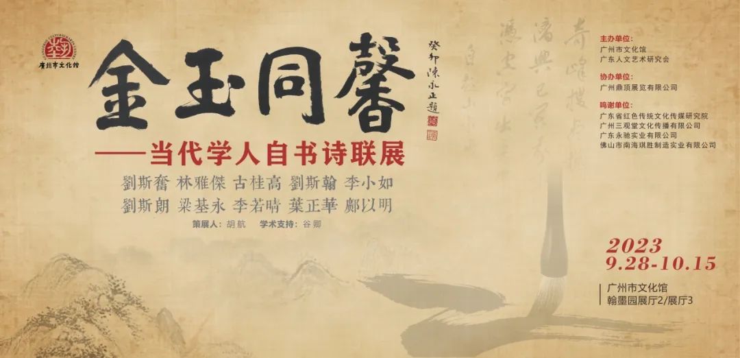 本次参展的当代学者分别为:刘斯奋、林雅杰、古桂高、刘斯翰、李小如、刘斯朗、梁基永、李若晴、叶正华、邝以明,十名岭南当代学人倾情创作,以书会友,品鉴艺术,如果你是书法爱好者,那么本次“金玉同馨——当代学人自书诗联展”绝对不容错过!