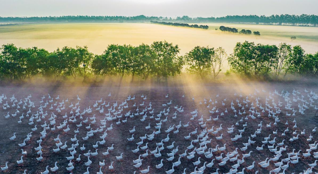 2022年5月3日,江苏省宿迁市泗洪县石集乡晨雾缭绕,一生态鹅养殖基地生机盎然,如梦似幻,宛若画卷。作者在色彩的碰撞中将画面定格。5月10日,这幅作品登上了《人民摄影》报头版,新华社图片编辑赞其为:“清新自然,不饰雕琢。”
