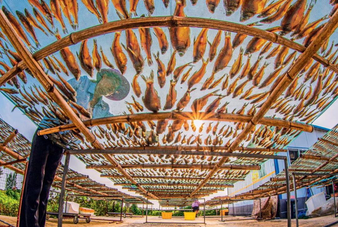 洪泽湖湖水清澈、满眼绿意,浩瀚的芦苇荡有着不同的四季景致,还拥有洪泽湖大闸蟹、清水小龙虾、天岗湖银鱼等地方特产,是当之无愧的“舌尖上的江南”。图为当地渔民晾晒的野生鱼干。