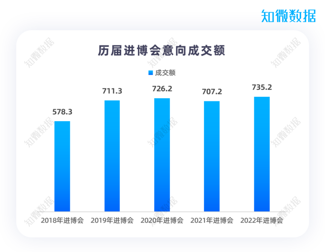 2022年第五届进博会意向成交金额最高,达735.2亿元。