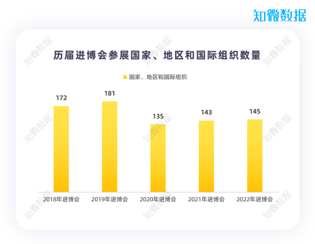 2022年第五届进博会,共145个国家、地区和国际组织参展。