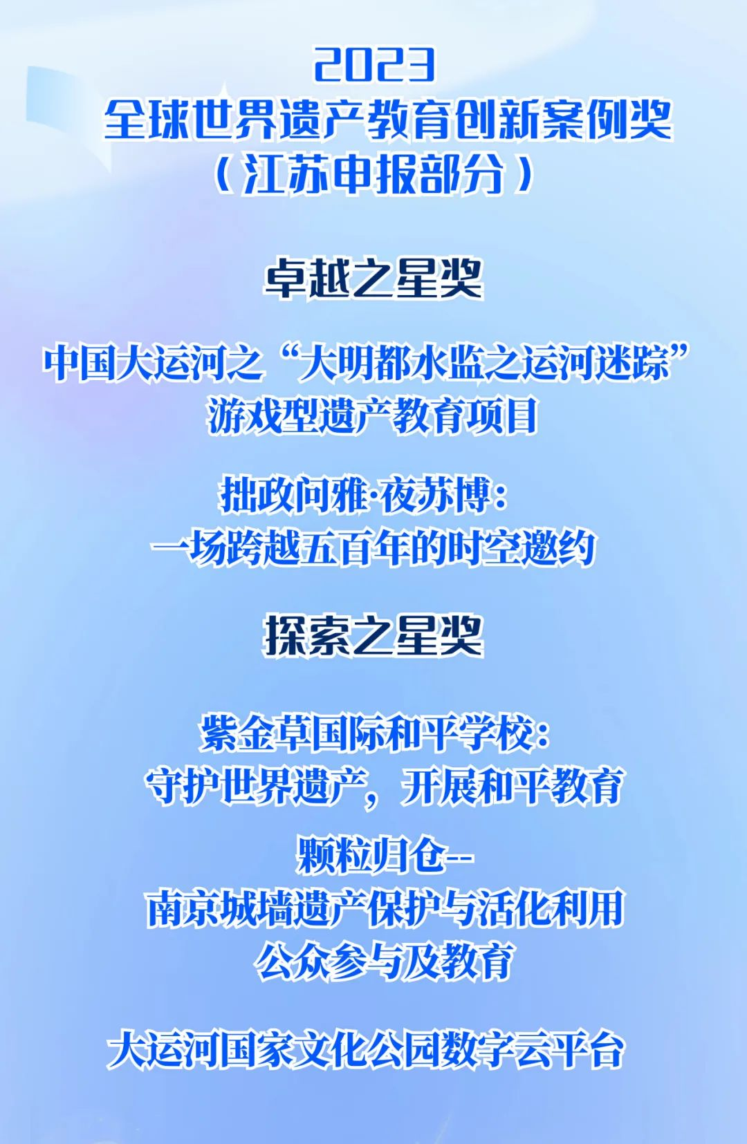第五届大运河文化旅游博览会正在苏州盛大举办期间,从万里之外的沙特传来消息,于当地时间9月17日开幕的联合国教科文组织第45届世界遗产大会举行期间,在“下一个五十年,面向未来的世界遗产教育”主题边会中,2023“全球世界遗产教育创新案例奖”(AWHEIC) 正式公布,由江苏省文化和旅游厅、江苏省文物局组织申报的五个案例从全球近百个案例中脱颖而出,分别荣获卓越之星奖、探索之星奖。