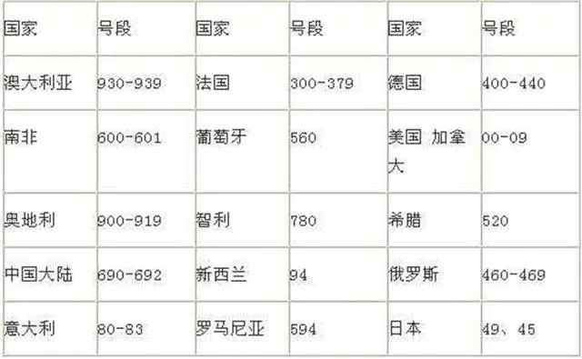 条形码上面的数字不是随便写的,每个数字都有它代表的含义,我们可以通过条形码前三个数字来确定红酒的原产地。比如以69开头的红酒就在国内灌装的,小编整理一些红酒原产国条形码的前缀,如下图所需。