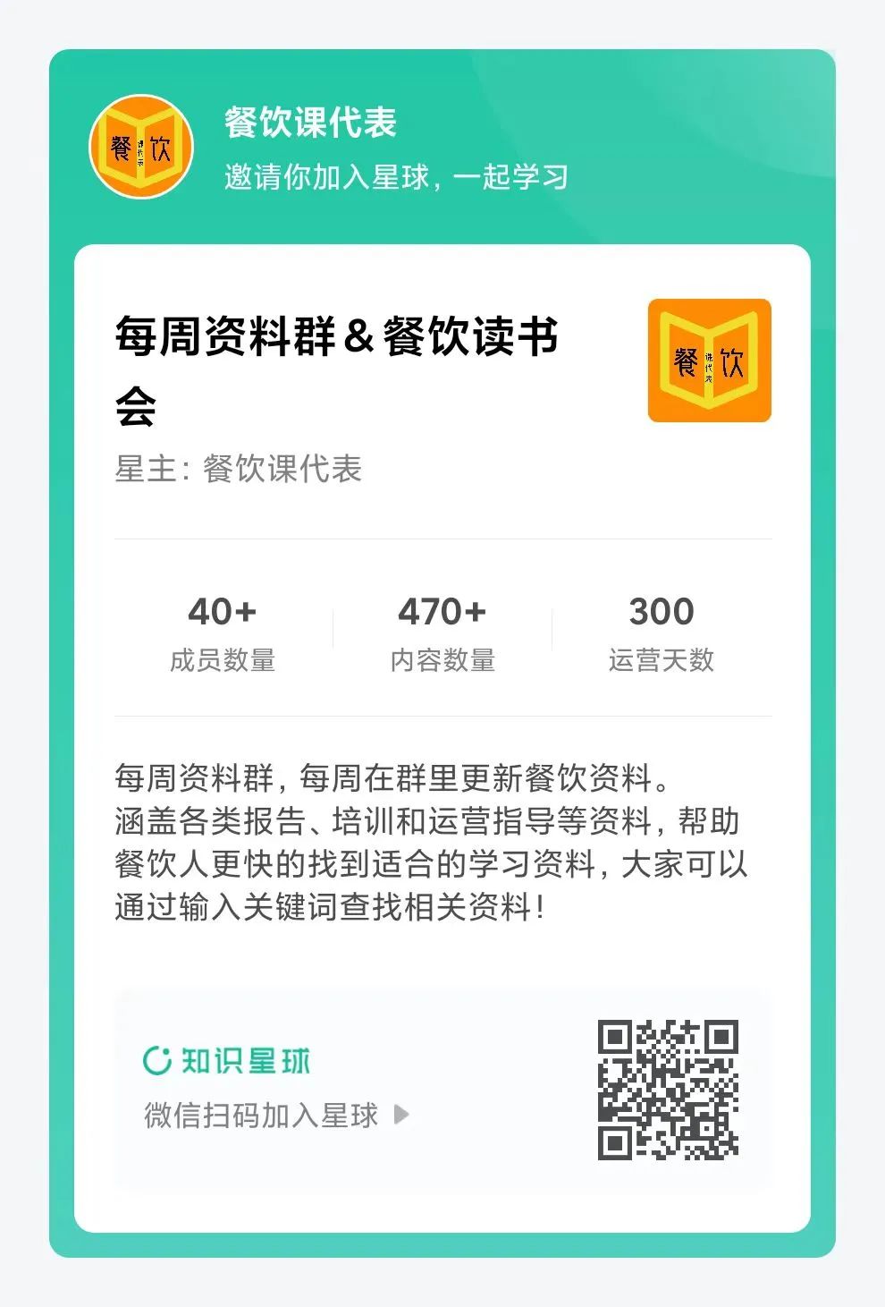 添加餐饮课代表微信,备注进群,邀请你加入餐饮课代表每周资料社群,每周发布至少一份餐饮报告或资料,免费领取,已经运营15个月以上,发布超过500份资料,涵盖行业报告、点评、营销、私域流量和品牌手册等。